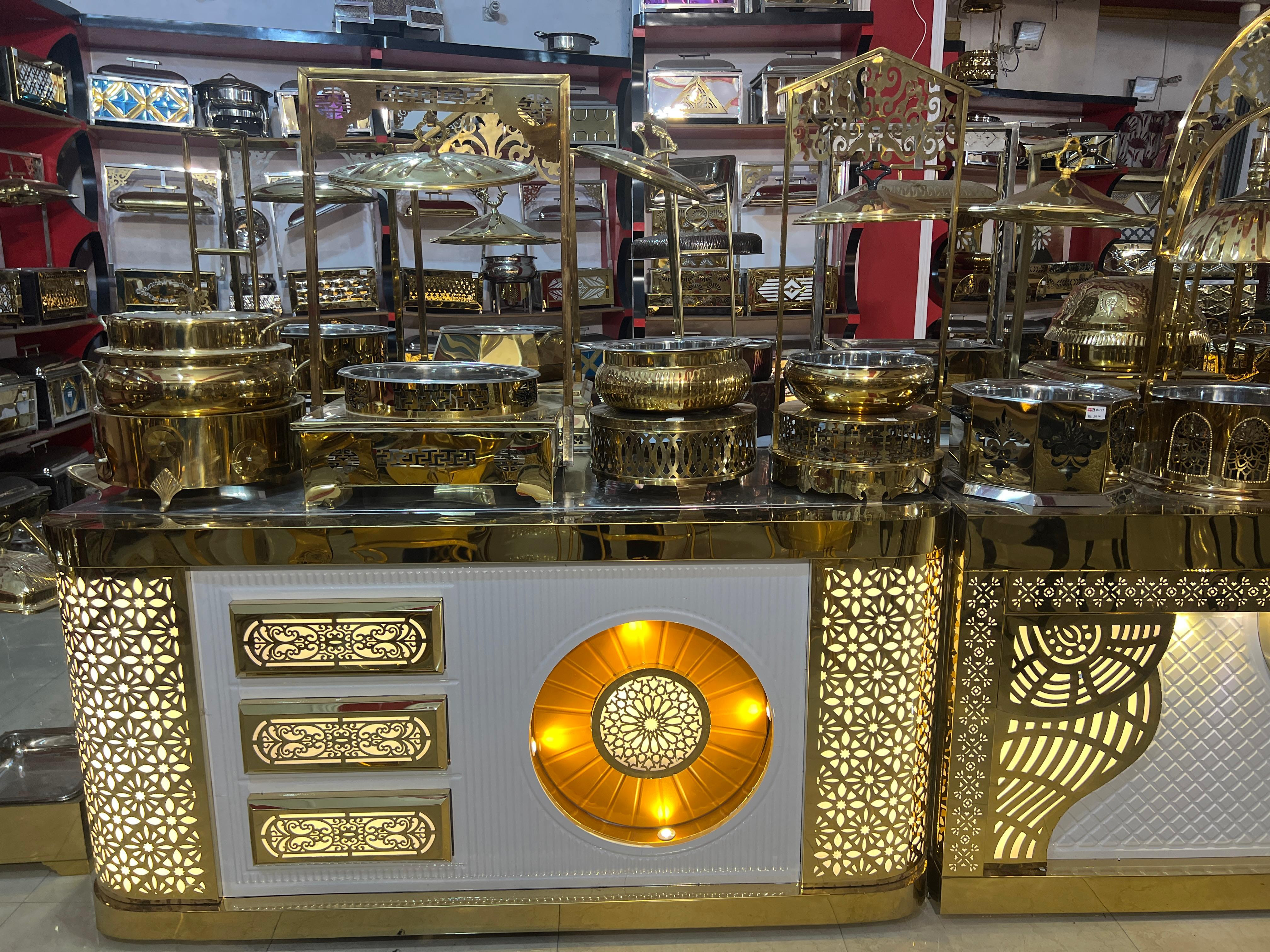 Elevate your food presentation with this exclusive collection of luxury gold-finish buffet chafing dishes, designed to bring elegance and functionality to high-end dining environments. Crafted from premium metal with a rich polished brass/gold tone, each piece features intricate cutwork, hammered textures, and traditional design elements inspired by Arabic and classic hospitality styles. This versatile assortment includes round, rectangular, and square chafing dishes with matching lids and elevated stands, ideal for keeping food warm while creating a striking visual display. Perfectly suited for hotels, banquet halls, weddings, catering services, Ramadan buffets, and fine-dining setups, these chafers combine durability with timeless sophistication.