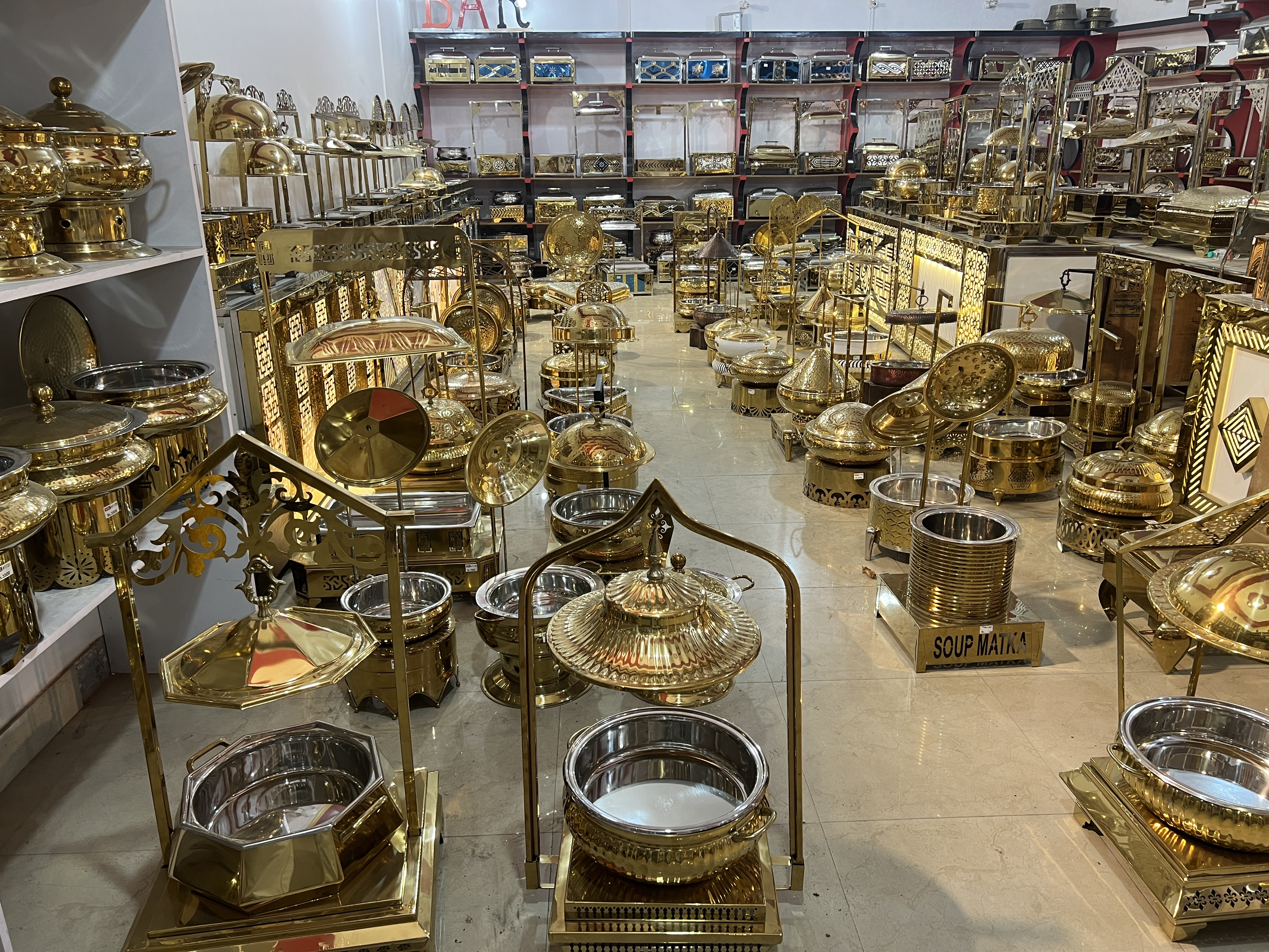 Premium metal construction with high-gloss gold/brass finish Assorted shapes: round, square, and rectangular designs Decorative cutwork, embossed, and hammered detailing Elevated stands for stable and elegant buffet presentation Ideal for professional catering and luxury hospitality use Hotels, banquet halls, wedding events, luxury catering services, restaurants, festive buffets, Ramadan & Eid celebrations, and high-end hospitality décor.